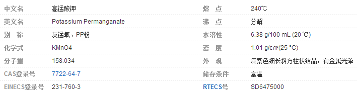 高錳酸鉀(Potassium permanganate)為黑紫色、細長的棱形結(jié)晶或顆粒,帶藍色的金屬光澤;無臭;與某些有機物或還原劑接觸,易發(fā)生爆炸,溶于水、堿液,微溶于甲醇、丙酮、硫酸,分子式為KMnO4,分子量為158.03400。熔點為240°C,穩(wěn)定,但接觸易燃材料可能引起火災(zāi)。要避免的物質(zhì)包括還原劑、強酸、有機材料、易燃材料、過氧化物、醇類和化學(xué)活性金屬。高錳酸鉀為氧化劑,用于有機合成、消毒、氧化等。與乙醚、乙醇、硫酸、硫磺、雙氧水等接觸會發(fā)生爆炸;遇甘油立即分解而強烈燃燒。要注意存儲,可使用PE儲罐存儲。