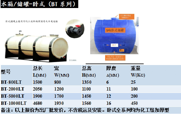 ①塑料儲罐一次成型整體性好,無焊縫,不滲漏,抗沖擊性能強,拉伸強度高,抗氧化、抗老化性能好,符合衛(wèi)生標(biāo)準(zhǔn)。